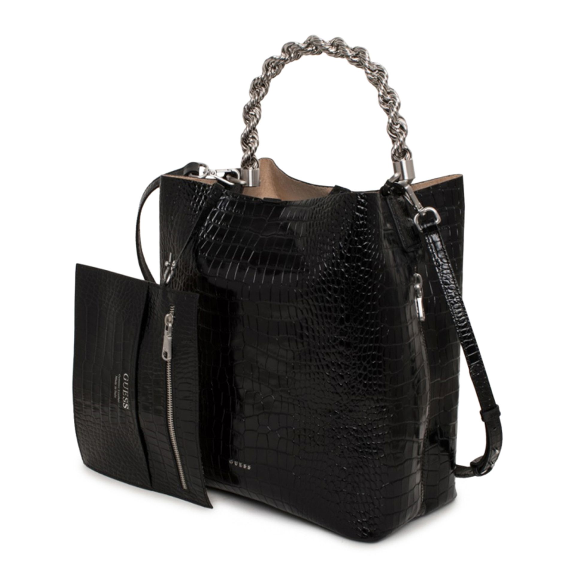 Tags Alle seizoenen, Black, Guess, Handtassen, Leather, Made in Italy, Reductions, Tassen, Vrouw, Zwart